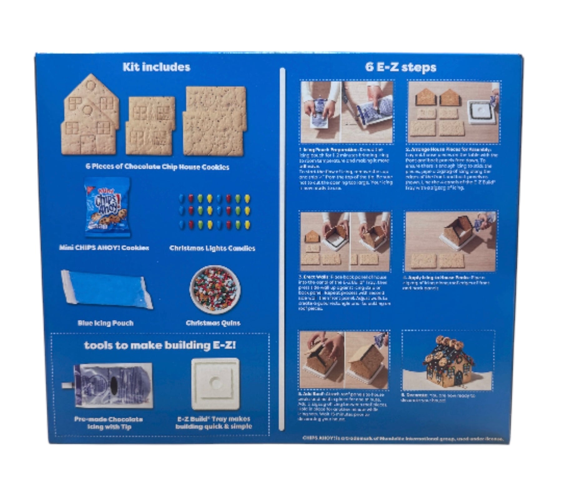 Kit Includes - chocolate chip cookie house cookies - mini chips ahoy cookies - Xmas light candies - icing - Christmas quins - easy build tray